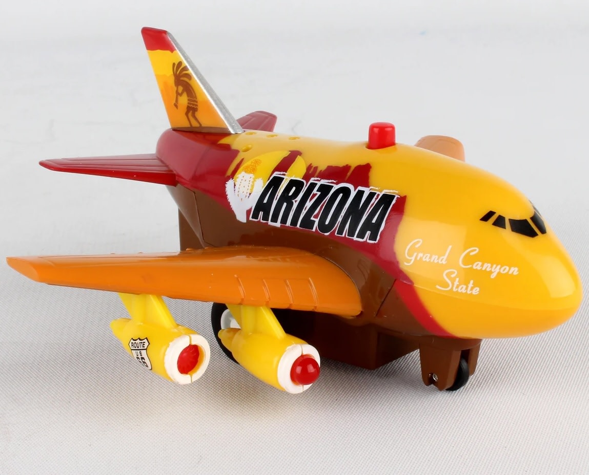 This stylized Arizona aircraft features an electronic jet sound and flashing red lights, which are activated by the push of a button on top of the fuselage! Pull the plane back and let it go forward in the take-off position.