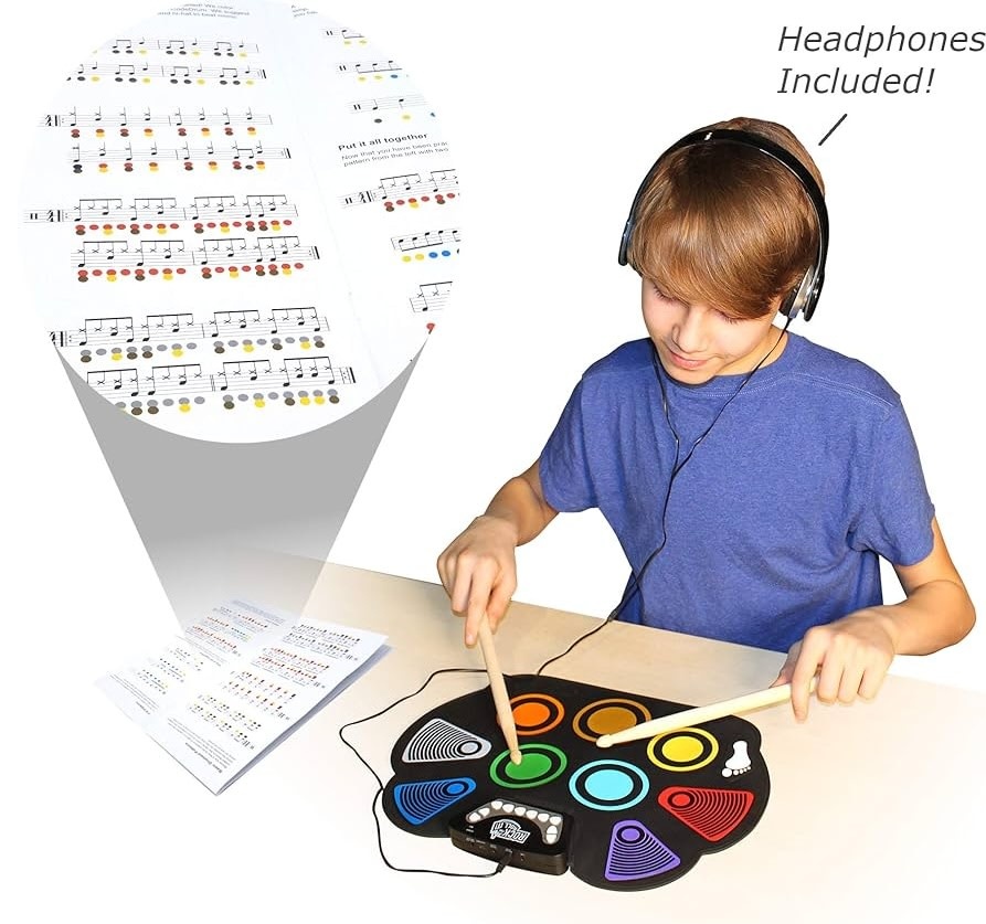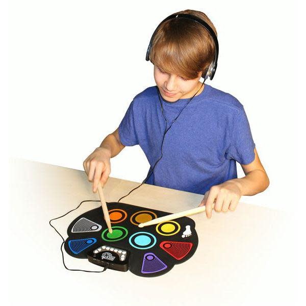 This is the coolest Drum Set ever with a Spectrum of color! This Rock N' Roll It! Specdrum comes with everything you need to begin learning how to play the drums. Kids will learn coordination and concentration, and develop a love of music without skipping a beat. The set features a play-by-color song booklet, multiple instrument tracks, record and playback, headphones, drumsticks, two foot pedals, and runs off USB or AAA battery power. The best part is the flexiblity and easy to carry anyhere. Let the music begin & no need to play in the basement!